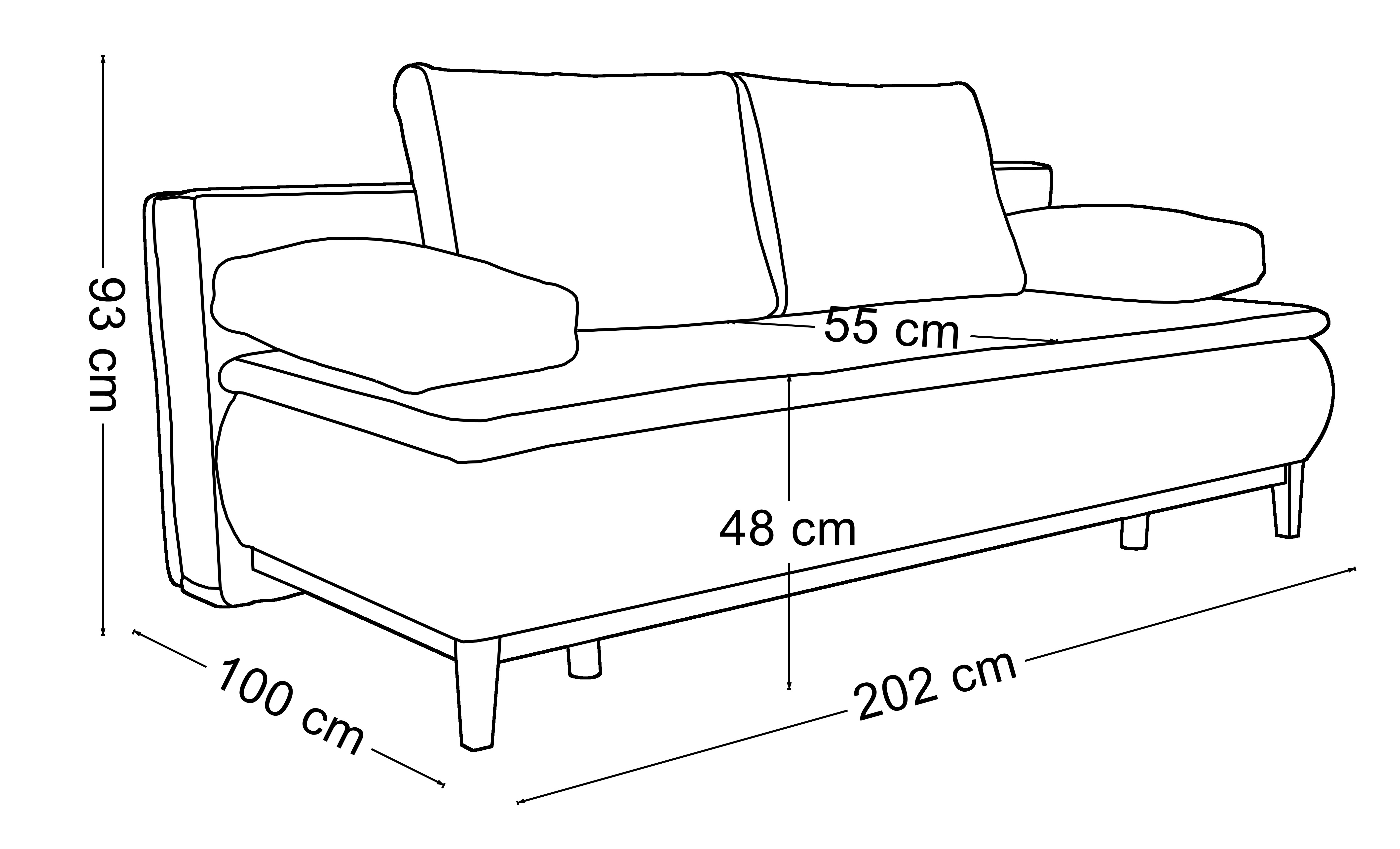 Sofa wyposażona jest w funkcję spania oraz pojemny schowek na pościel, dzięki czemu doskonale sprawdza się zarówno w salonie, jak i w pokoju gościnnym czy młodzieżowym.