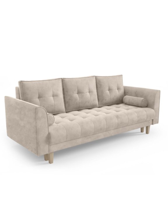 Kanapa Nexus marki PK Mebel to elegancka, 3-osobowa sofa, która łączy ponadczasowy design z wysoką funkcjonalnością. Pikowane siedzisko, trzy komfortowe poduszki oparciowe oraz dekoracyjne wałki nadają jej stylowy charakter, a możliwość wyboru koloru nóżek (białe / czarne / naturalne) pozwala dopasować mebel do aranżacji salonu.