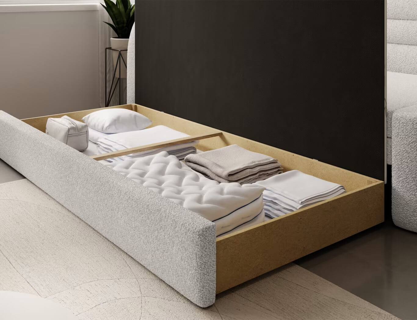 Dodatkowy schowek na pościel (193 × 57 × 19 cm) pozwala na przechowywanie kołdry, poduszek i innych tekstyliów w porządku.
