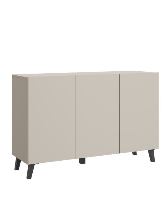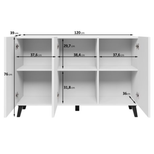 Komoda wyposażona jest w trzy zamykane segmenty z półkami, które dzielą przestrzeń na sześć funkcjonalnych stref przechowywania. Taki układ pozwala na wygodne segregowanie rzeczy i utrzymanie porządku.