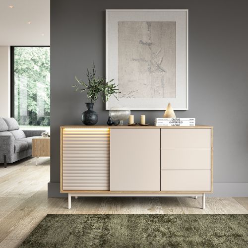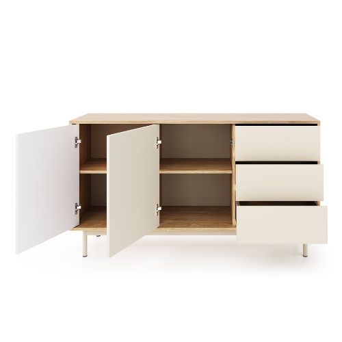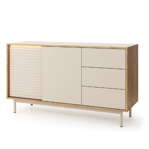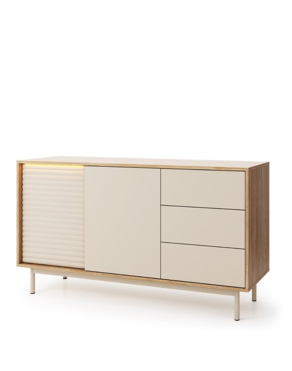 Front komody został podzielony na trzy części: po lewej stronie znajduje ryflowany front, która skrywa praktyczne półki. W centralnej części umieszczono szafki z gładkimi frontami, a z prawej strony komody zaprojektowano trzy szuflady, idealne miejsce do przechowywania drobnych rzeczy.