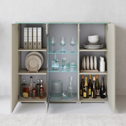 Komoda z witryną Vera to połączenia elegancji, nowoczesnego designu i funkcjonalności, który wnosi do wnętrza wyjątkowy klimat. Jej minimalistyczna forma, wykończona w kaszmirowym kolorze wprowadza do wnętrza nutę luksusu i wyrafinowania, tworząc wyjątkowy kontrast wobec subtelnego, chłodnego światła LED podkreślającego szklane półki.