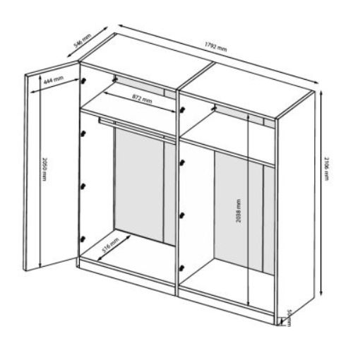 Wnętrze szafy zostało starannie przemyślane. Model podzielony jest na dwa szerokie segmenty. Wysokie przestrzenie z drążkami umożliwiają przechowywanie dłuższych ubrań, takich jak płaszcze, sukienki czy marynarki, bez obawy o ich zagniecenie.