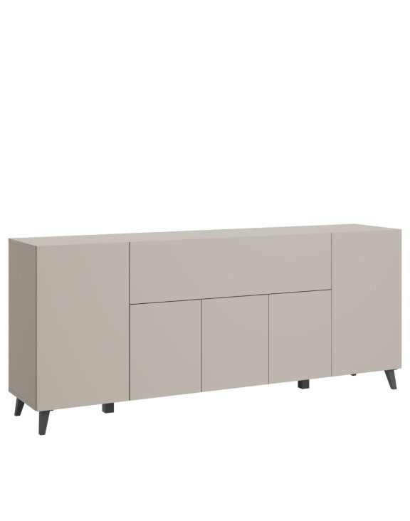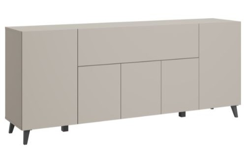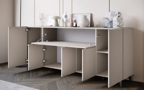 Kaszmirowa komoda SB180 wyróżnia się imponującą szerokością, co przekłada się na bardzo dużą przestrzeń do przechowywania. W jej wnętrzu znajduje się kilka zamykanych segmentów, które pozwalają na komfortową organizację, a dzięki pełnym frontom wszystkie przechowywane rzeczy pozostają niewidoczne, co pomaga utrzymać estetyczny i uporządkowany wygląd pomieszczenia.