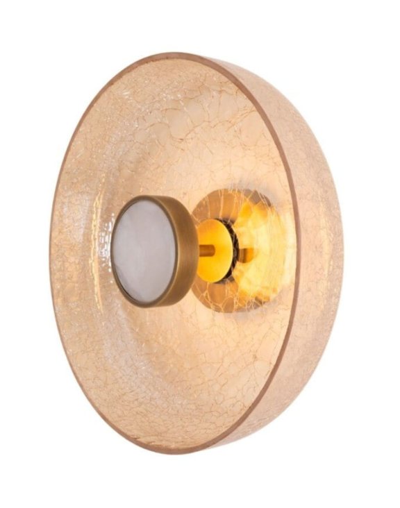 Kinkiet przypomina dekoracyjny talerz, subtelnie unoszącą się na ścianie. Szkło o delikatnej, promienistej strukturze rozprasza światło w niezwykle efektowny sposób, tworząc świetliste refleksy i ciepłą atmosferę. Centralny element z polerowanej miedzi nadaje kompozycji głębi, podkreślając jej wyjątkowość i nadając całości luksusowy sznyt.