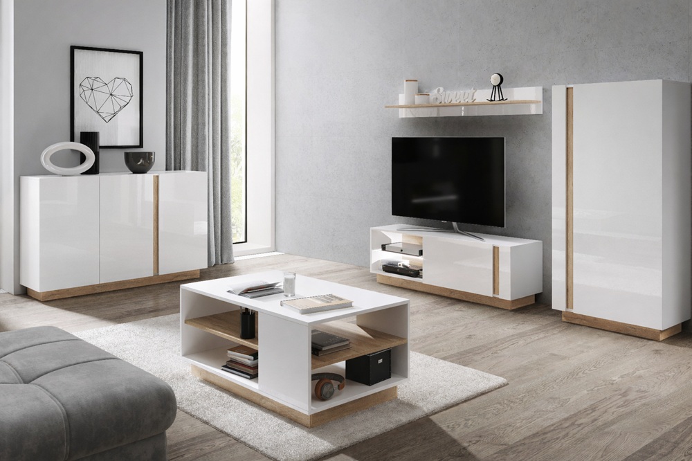 Meblościanka Arco biała – połysk, dębowe akcenty, witryny z LED i szafka RTV. Styl i funkcjonalność w jednym. Zamów online!