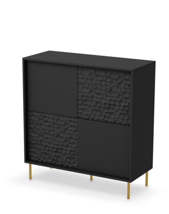 Fronty komody wyróżniają się intrygującym dekorem 3D w formie delikatnych wgłębień, które nadają meblowi subtelny, ale zarazem wyraźny charakter.