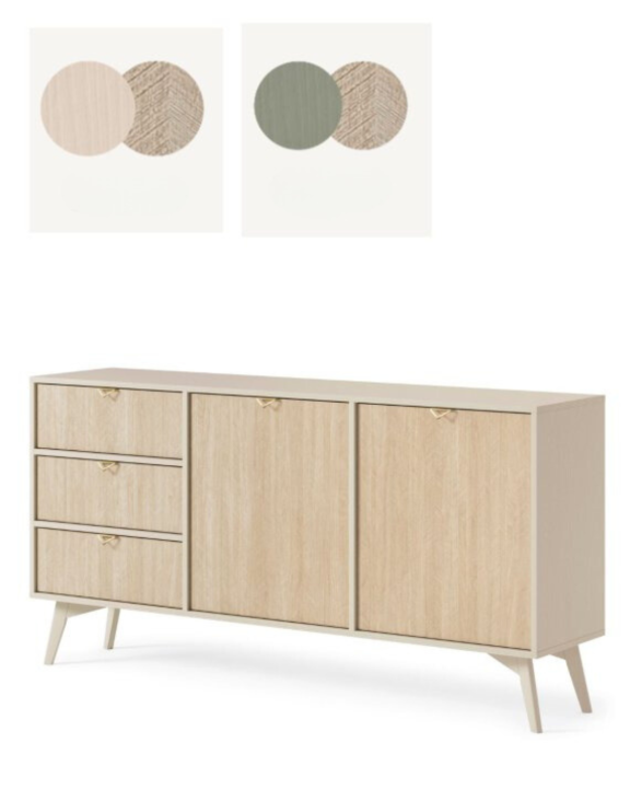 Komoda jest dostępna w dwóch kolorach: beżowym i eukaliptusowym, co pozwala dopasować ją do różnorodnych wnętrz, dodając im wyjątkowego charakteru i funkcjonalności.