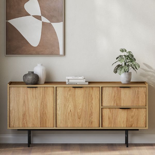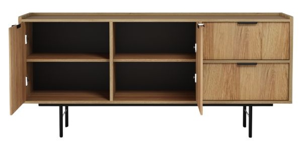 - Ponadczasowy design - minimalistyczna forma, wyraziste usłojenie drewna i metalowe detale sprawiają, że komoda pasuje zarówno do wnętrz nowoczesnych, jak i klasycznych.