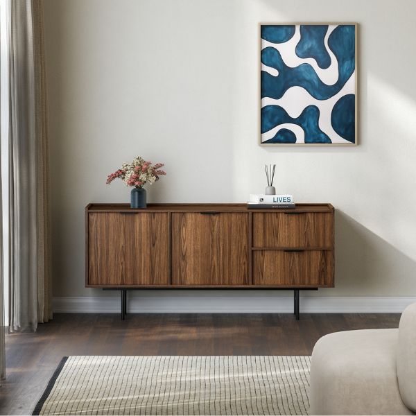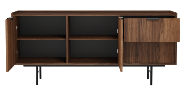 - Ponadczasowy design - minimalistyczna forma, wyraziste usłojenie drewna i metalowe detale sprawiają, że komoda pasuje zarówno do wnętrz nowoczesnych, jak i klasycznych.