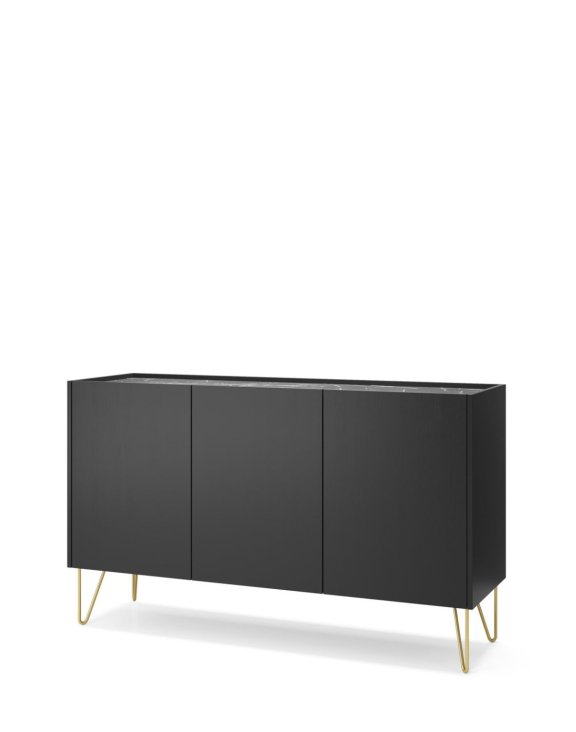 Jej czarny kolor nadaje wnętrzu głębi, podkreślając jednocześnie nowoczesny styl. Blat imituje czarno-biały marmur, dodając komodzie wyjątkowego charakteru.