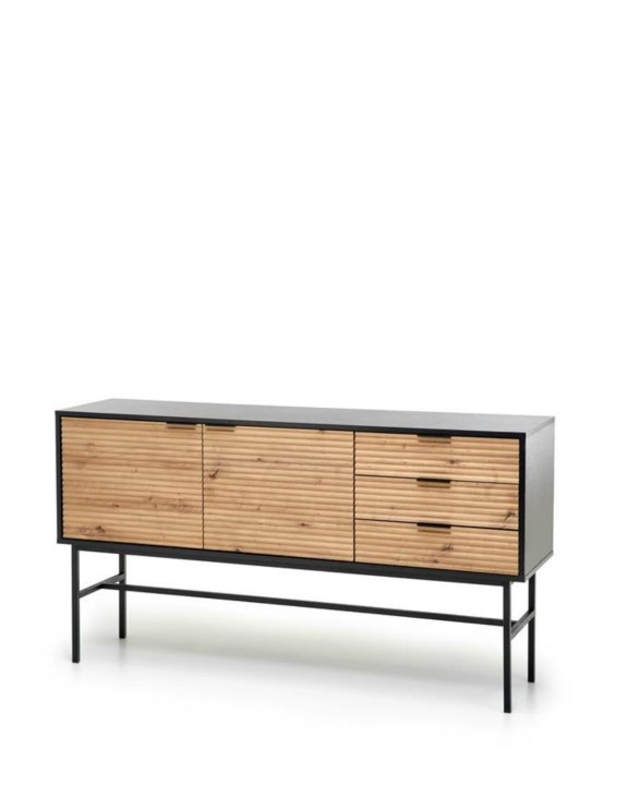 Ciepły odcień dębu artisan stylowo kontrastuje z czernią korpusów i nóżek.