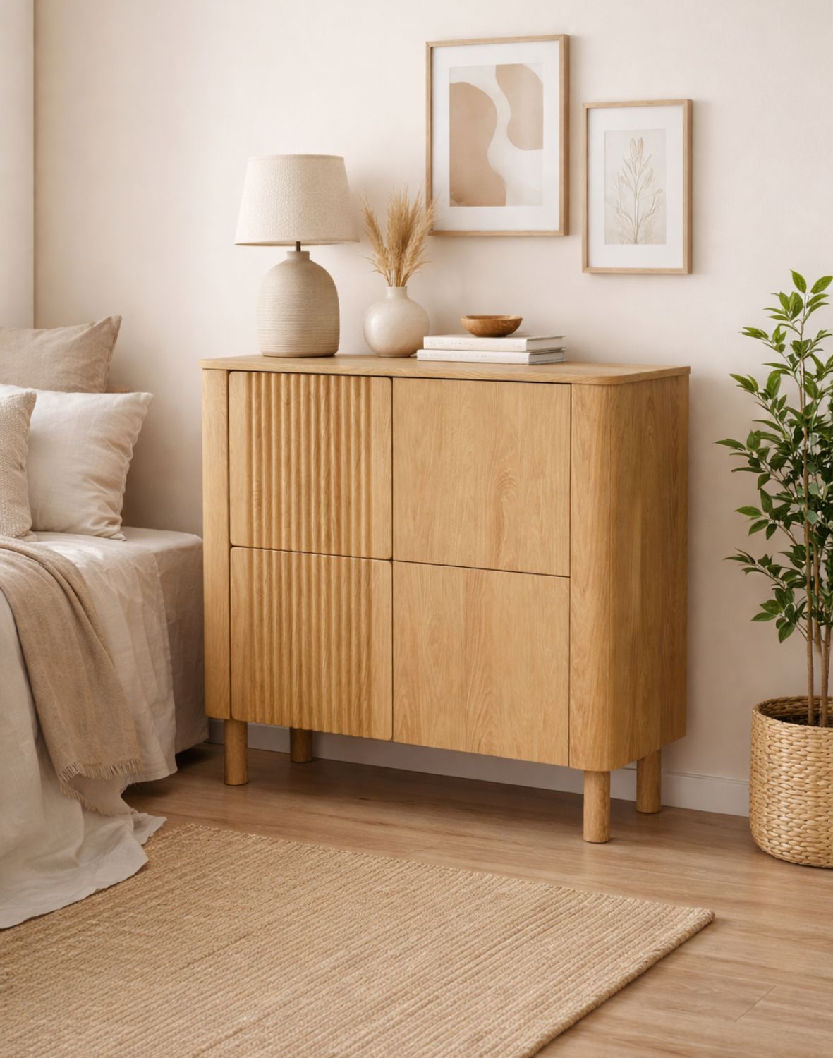 Naturalna kolorystyka inspirowana drewnem wprowadza do wnętrza ciepło i elegancję, a minimalistyczna forma sprawia, że mebel doskonale komponuje się zarówno z nowoczesnymi, jak i klasycznymi aranżacjami.