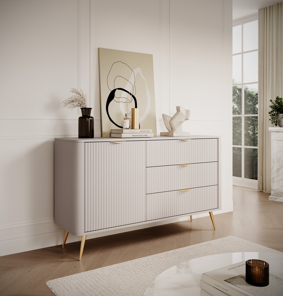 Komoda z szufladami beżowa Lante D 138 - ryflowane fronty, złote nogi