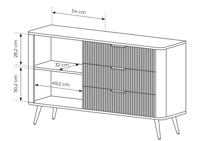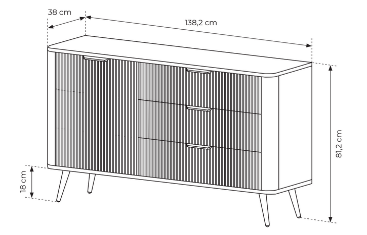 to stylowy mebel do sypialni lub salonu, który łączy nowoczesny design z elegancją glamour. Beżowe ryflowane fronty MDF, złote metalowe nogi oraz funkcjonalny układ z szafkami i szufladami zapewniają wygodne przechowywanie i efektowny wygląd wnętrza.Komoda Lante C 163