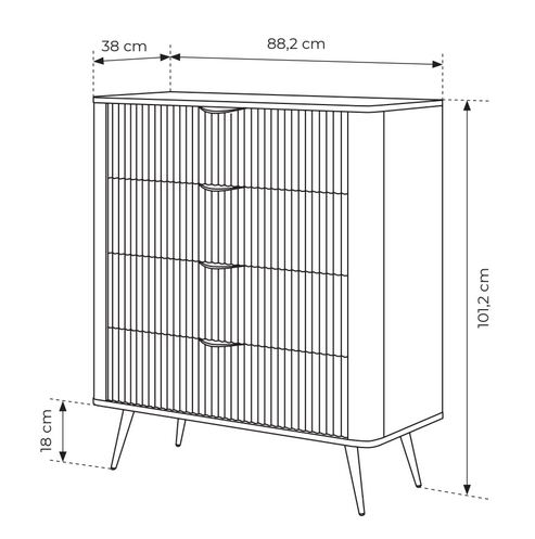 to stylowy mebel do sypialni lub salonu, który łączy nowoczesny design z elegancją glamour. Beżowe ryflowane fronty MDF, złote metalowe nogi oraz funkcjonalny układ z szafkami i szufladami zapewniają wygodne przechowywanie i efektowny wygląd wnętrza.Komoda Lante C 163