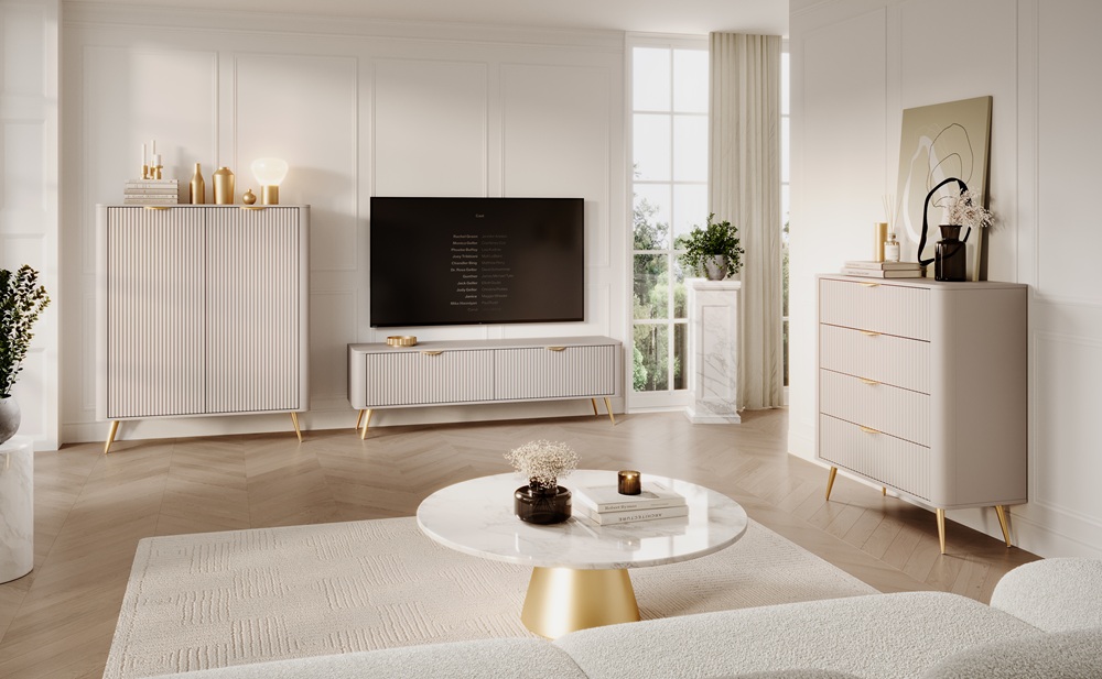 Komoda Lante D 138 d3s to stylowe połączenie ryflowanych frontów MDF, subtelnej beżowej kolorystyki oraz złotych detali. Funkcjonalny układ z szafką i trzema szufladami sprawdzi się idealnie w salonie lub sypialni, oferując elegancję i wygodę na co dzień.