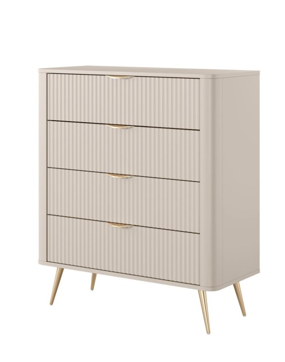 Komoda Lante L 4 szuflady beż – ryflowana komoda glamour ze złotymi uchwytami