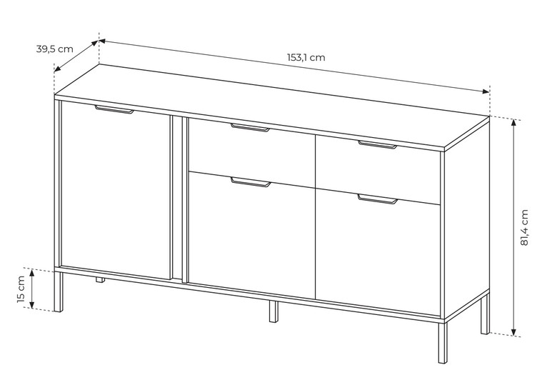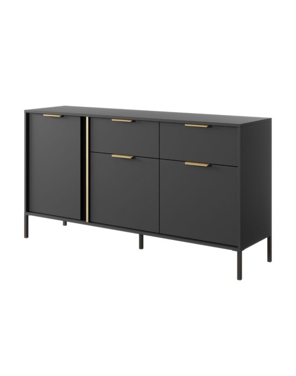 Komoda Lars A 2D2S to nowoczesny mebel w kolorze antracyt z eleganckimi złotymi uchwytami i smukłymi metalowymi nogami. Praktyczny układ z szufladami i półkami zapewnia wygodne przechowywanie i doskonale sprawdzi się w salonie lub jadalni.