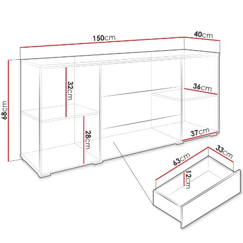 Komoda składa się z trzech pojemnych szuflad oraz dwóch szafek bocznych z półkami, które oferują dużo miejsca do przechowywania.
