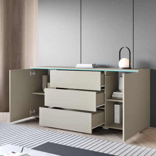 Kaszmirowa komoda led z szufladami i szafkami to elegancki i nowoczesny mebel, który łączy w sobie funkcjonalność z wyjątkową estetyką. Komoda wykonana w kolorze kaszmir stanowi doskonały wybór do wnętrz urządzonych w stylu loftowym, nowoczesnym, a także skandynawskim.
