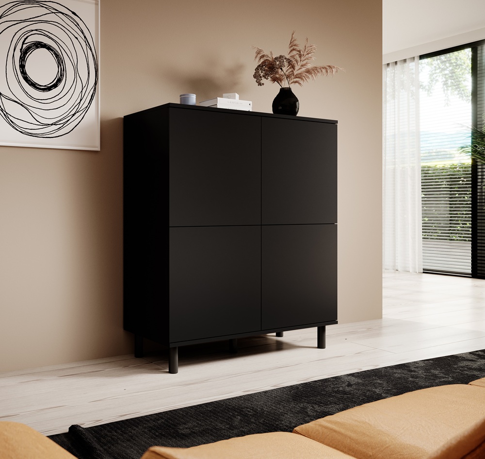 Komoda 4D Logan w kolorze czarny mat to nowoczesny i funkcjonalny mebel, który doskonale sprawdzi się w salonie, sypialni, przedpokoju lub gabinecie. Prosta, geometryczna bryła w połączeniu z gładkimi frontami bez uchwytów tworzy elegancką i ponadczasową formę, pasującą do wnętrz w stylu nowoczesnym, loftowym oraz minimalistycznym.