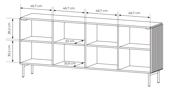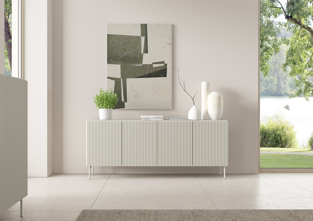 Komoda Muti A w dekorze kaszmir to połączenie stylowego designu i funkcjonalności. Ryflowane fronty, wygodne otwieranie push-to-open i smukłe nóżki tworzą nowoczesny mebel do Twojego wnętrza. Zamów teraz i odmień swój salon!