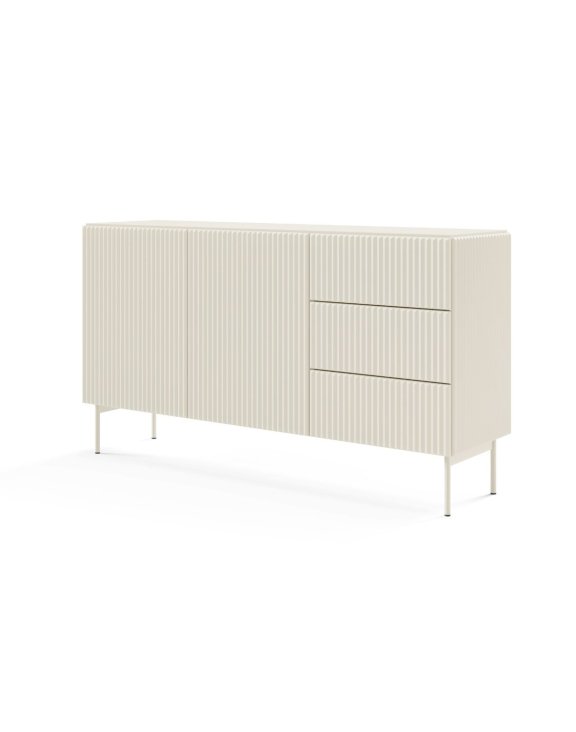 Komoda Muti A w dekorze kaszmir to połączenie stylowego designu i funkcjonalności. Ryflowane fronty, wygodne otwieranie push-to-open i smukłe nóżki tworzą nowoczesny mebel do Twojego wnętrza. Zamów teraz i odmień swój salon!