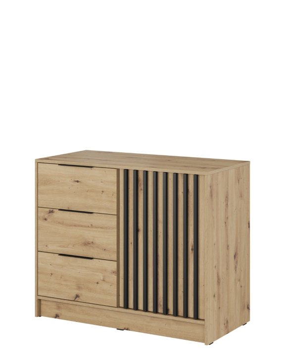Charakterystycznym elementem komody są czarne lamele umieszczone na drzwiach, które dodają jej unikalnego stylu i charakteru oraz czarne uchwyty z tworzywa sztucznego.