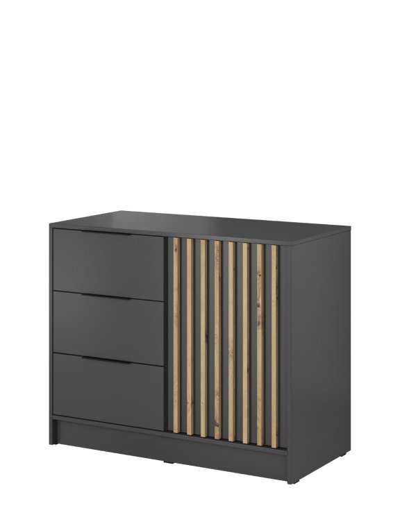 Charakterystycznym elementem komody są lamele w kolorze dąb artisan umieszczone na drzwiach, które dodają jej unikalnego stylu i charakteru oraz czarne uchwyty z tworzywa sztucznego.