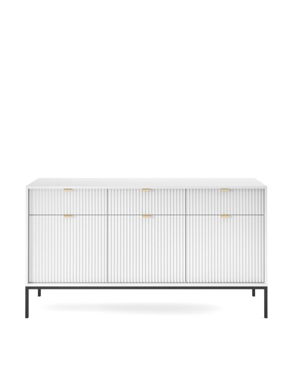 Komoda Nova biała z szufladami (KSZ154) z czarnym stelażem marki Piaski to elegancki i funkcjonalny mebel, który doskonale sprawdzi się w salonie bądź sypialni.