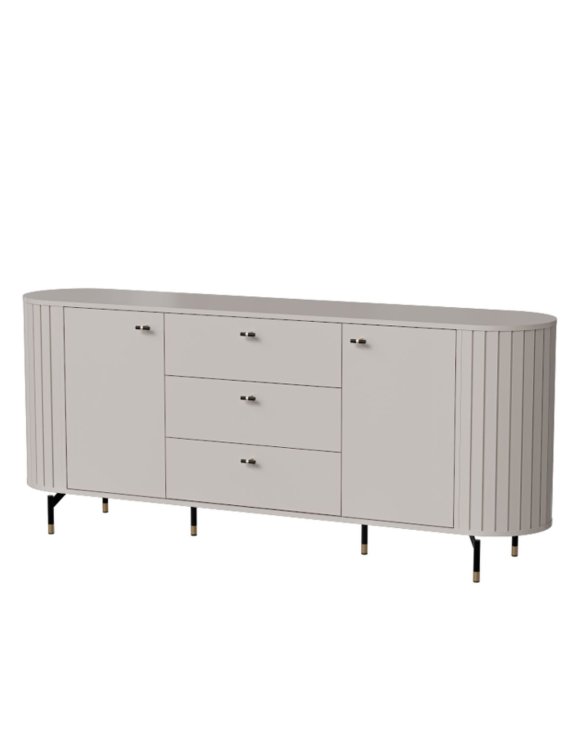 Ryflowane boki komody, kaszmirowy kolor oraz subtelne uchwyty są odpowiedzią na obowiązujące trendy.