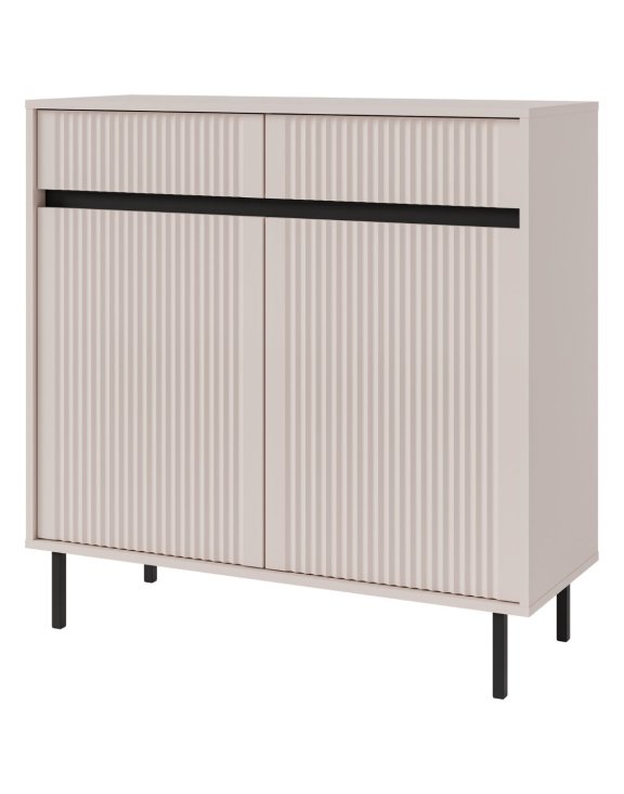 Kontrastowe czarne akcenty i smukłe metalowe nogi nadają komodzie lekkości i elegancji, sprawiając, że doskonale wpisze się zarówno w aranżacje nowoczesne, japandi, jak i industrialne.