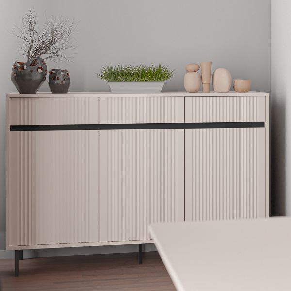 Frezowane pionowo fronty nadają meblowi subtelnej elegancji, a beżowy odcień wnosi do wnętrza przytulność i harmonię inspirowaną estetyką japandi.