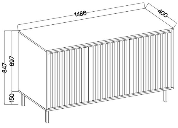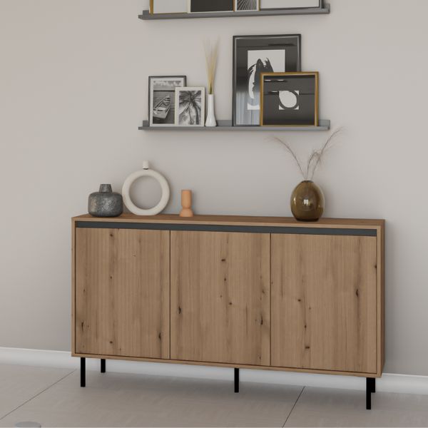 Trzy pojemne szafki z wewnętrznymi półkami zapewniają dużą przestrzeń do przechowywania, idealną do salonu, jadalni lub sypialni.