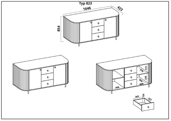 Komoda Ovalio Typ 823 zachwyca zaokrąglonymi kształtami oraz precyzyjnymi frezami, które nadają jej wyjątkowego charakteru.