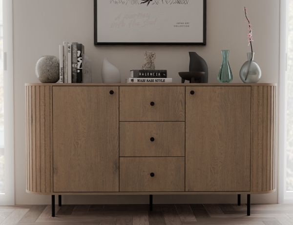 Komoda Ovalio doskonale sprawdzi się w salonie, sypialni czy jadalni, stanowiąc elegancki akcent wnętrza i oferując funkcjonalność na co dzień.