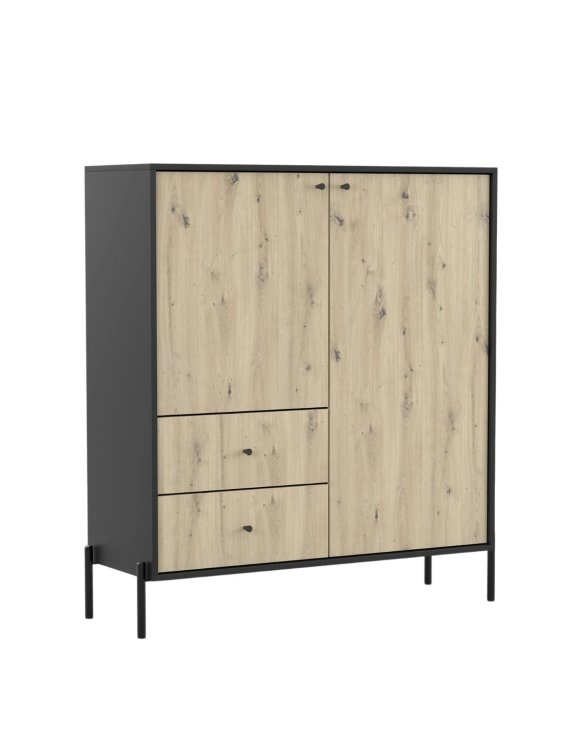Wyposażona w dwie pojemne szafki i dwie funkcjonalne szuflady z metalowymi czarnymi uchwytami, komoda zapewnia dużo miejsca na przechowywanie ubrań, dokumentów, dekoracji lub sprzętów codziennego użytku.