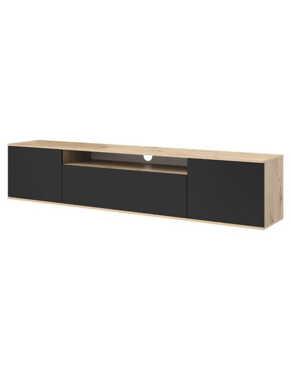 Komoda RTV 200 Logan w wersji wiszącej to nowoczesna i elegancka propozycja do salonu, która doskonale wpisuje się w aktualne trendy aranżacyjne. Połączenie dekoru dąb artisan z czarnymi, matowymi frontami tworzy ponadczasowy kontrast, podkreślający minimalistyczny charakter mebla.