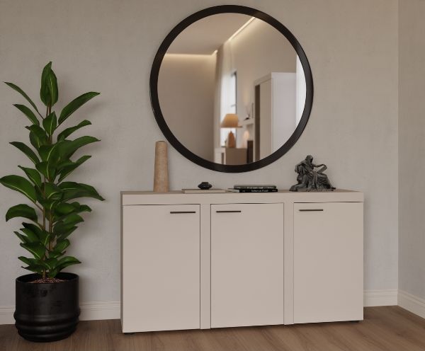 Komoda Rumba 3F w kolorze beżu piaskowego to idealne połączenie estetyki i funkcjonalności.