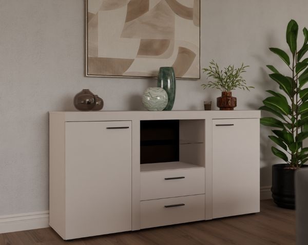 Komoda Rumba 2F2S w kolorze beżu piaskowego to idealne połączenie estetyki i funkcjonalności.