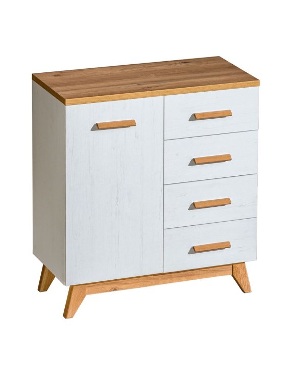 Skandynawska komoda z szufladami i szafką o ponadczasowym designie. Model utrzymany w kolorystyce sosna andersen, który został przełamany wyrazistymi akcentami w odcieniu dąb nash, które dodają całości charakteru i ciepła.