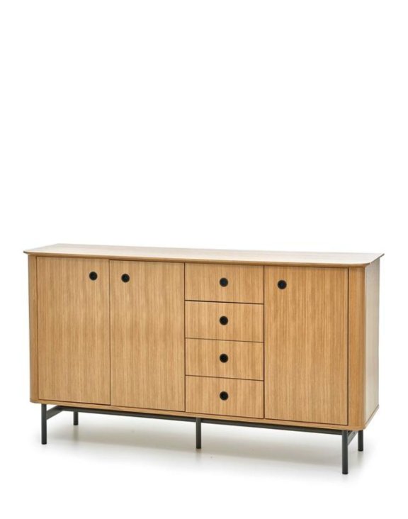 Ciepły odcień dębu stylowo kontrastuje z czernią uchwytów oraz nóżek. Komoda idealnie wpasuje się w styl retro jak i nowoczesny.