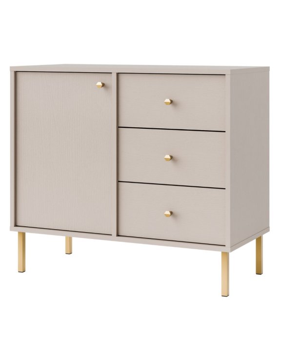 Komoda wyposażona została w trzy pojemne szuflady oraz jedną zamykaną szafkę z półką – idealne miejsce na dokumenty, tekstylia, naczynia czy drobiazgi codziennego użytku.