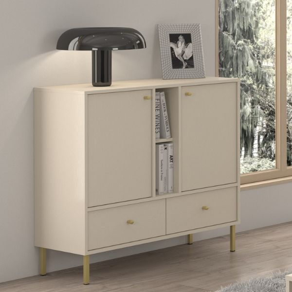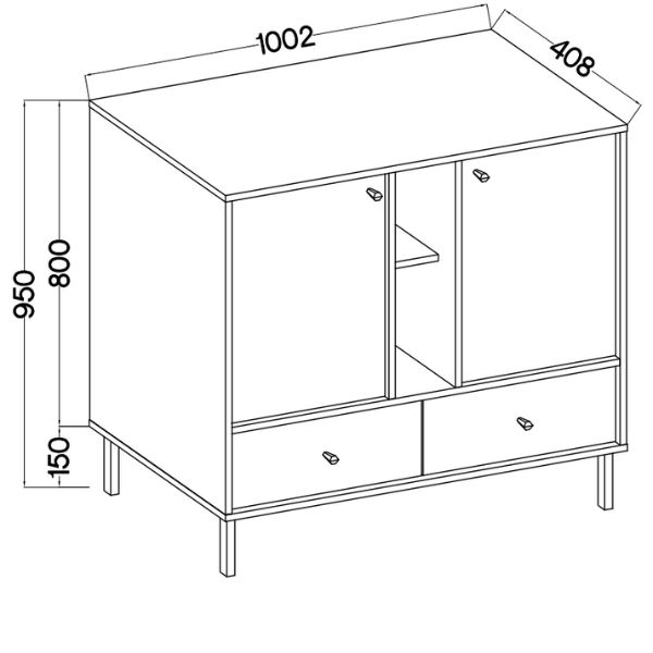 Wyposażona w dwie pojemne szafki, dwie dolne szuflady oraz otwartą przestrzeń z półką, komoda pozwala z łatwością uporządkować codzienne przedmioty i wyeksponować dekoracje.