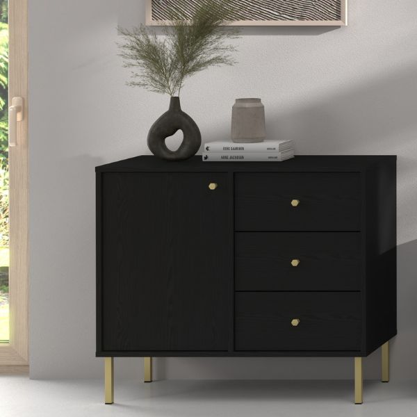 Komoda wyposażona została w trzy pojemne szuflady oraz jedną zamykaną szafkę z półką – idealne miejsce na dokumenty, tekstylia, naczynia czy drobiazgi codziennego użytku.