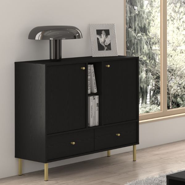 Wyposażona w dwie pojemne szafki, dwie dolne szuflady oraz otwartą przestrzeń z półką, komoda pozwala z łatwością uporządkować codzienne przedmioty i wyeksponować dekoracje.