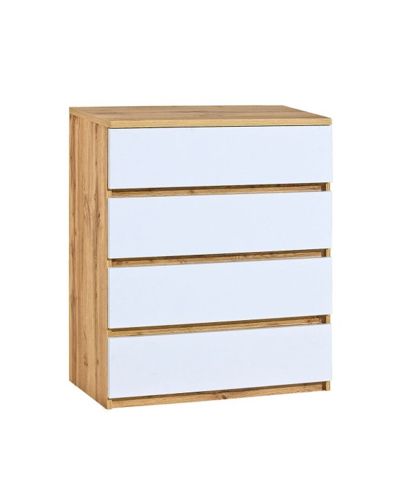 Fronty szuflad wykonane są w kolorze arktycznej bieli, a korpus mebla w kolorze dąb wotan, dzięki czemu mebel rozświetla przestrzeń i wprowadza ciepłe skojarzenia.