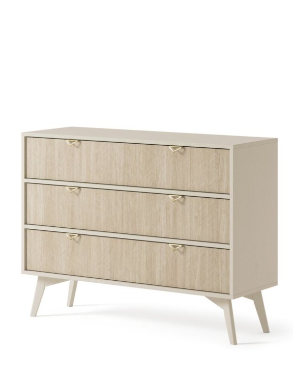 Front komody, wykonany z dekoracyjnej jodełki skandynawskiej, dodaje delikatnego uroku i charakteru.
