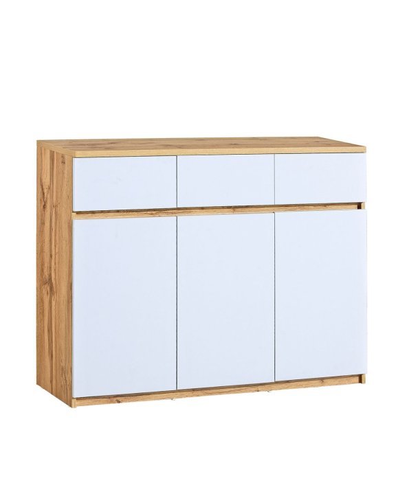 Komoda z trzema szufladami i trzema szafkami, za których frontem znajdują się półki, pozwala na uporządkowanie przestrzeni.